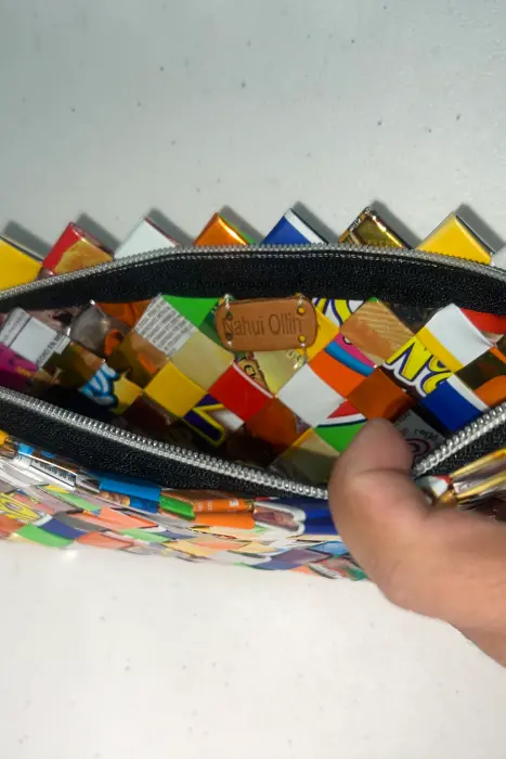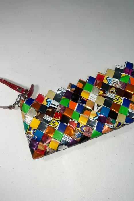 Nahui Ollin Clutch. Bonito y colorido clutch de los 90s. Bolso único hecho de material reciclado. Respetuoso con el medio ambiente, versátil, pieza de declaración, ideal para el uso diario. Incluye una correa roja desmontable que se puede quitar para usar el bolso como bolso de mano o como pulsera. Medidas 12 x 25 cm.