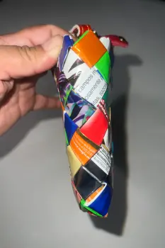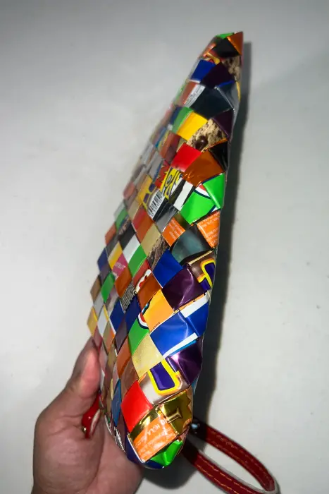 Bonito y colorido clutch de los 90s. Bolso único hecho de material reciclado. Respetuoso con el medio ambiente, versátil, pieza de declaración, ideal para el uso diario. Incluye una correa roja desmontable que se puede quitar para usar el bolso como bolso de mano o como pulsera. Medidas 12 x 25 cm.