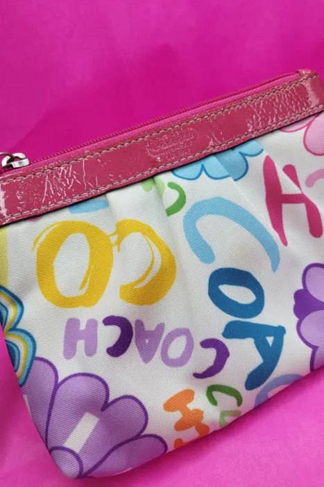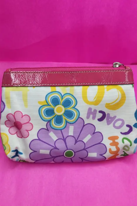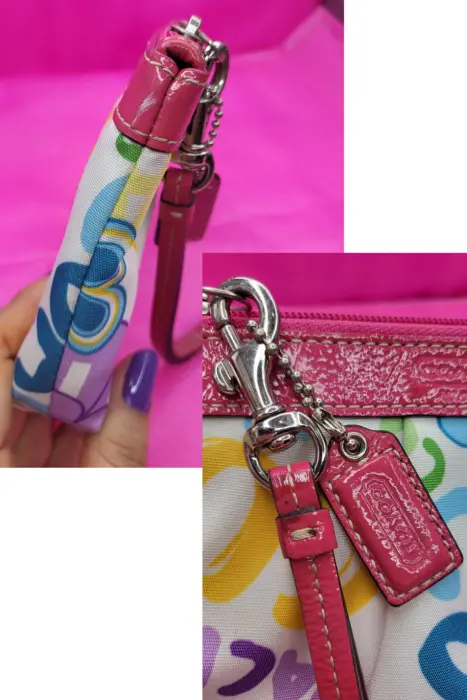 🪞Wrislet Coach Rosa🪐. ⭐Wrislet estampada rosa con flores de colores, tiene algunos pequeños detalles (ver fotos).📏17.5 x 12 cms aprox.💝Preloved🔖MMBYMTN109