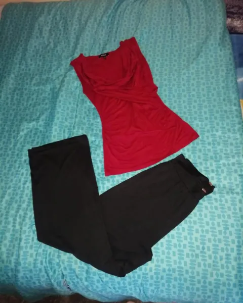 CONJUNTO INCLUYE: PANTALÓN PALAZZO NUEVO SIN ETIQUETA TALLA CHICA, MARCA CONTEMPO Y BLUSA ROJA SEMI NUEVA TALLA EXTRA CHICA/CHICA MARCA EXPRESS.
