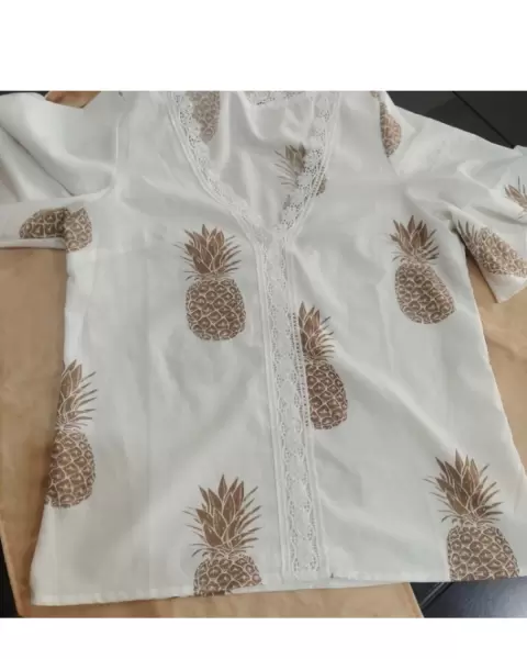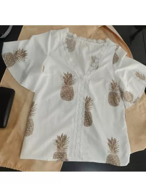 Bonita blusa con manga acampanada con diseño de piñas doradas, cuello v con encaje en bien estado solo se utilizó 1 vez, minifaldacuadrada con botones de adorno, en. Buen estado utilizada 1 sola vez ( puedo vender separado si lo deseas).