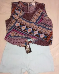 Conjuntito. Conjunto de shorts azul cielo y blusita sin mangas se hace nudo en la cintura.