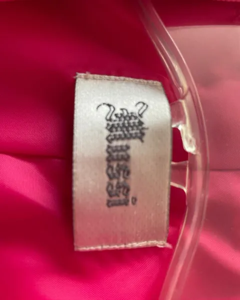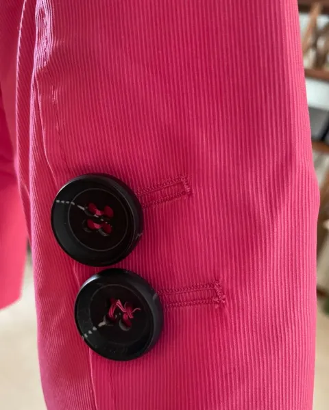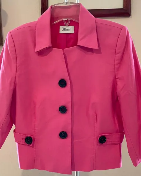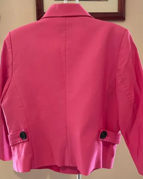 Conjunto de falda corta y saco rosa, la falda mide 55 cms