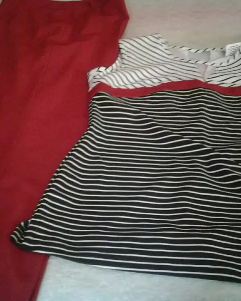 Onjunto en buen estado,pantalon rojo,blusa en rayas negro con blanco