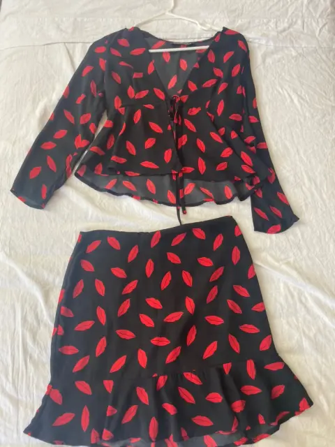 Conjunto. Conjunto de minifalda con su saquito, color negro con estampado de labios