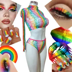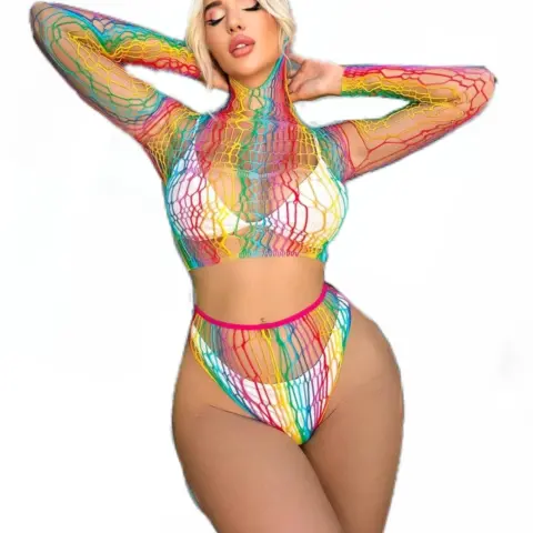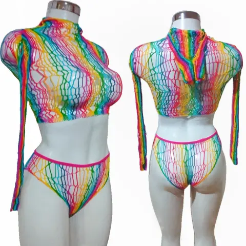 Conjunto Arcoiris Sensual Unitalla. Conjunto Arcoiris Sensual Unitalla Contiene un top y un calzon de red Poliamida y Elastano Color Arcoiris UnitallaOcupalo para una noche divertida, salida de playa , alberca , festivales , fiestas temáticas Combinalo con jeans, shorts , faldas , tutús Destaca tu belleza ! No incluye bra ni panty