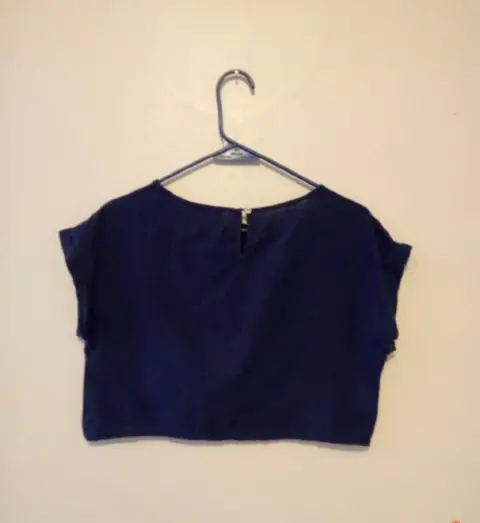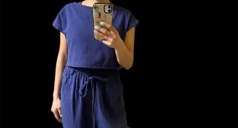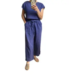 Conjunto pantalón y crop color azul marino, pantalón con cintura ajustable, tipo lino.