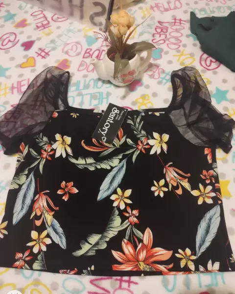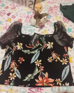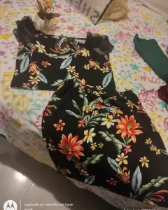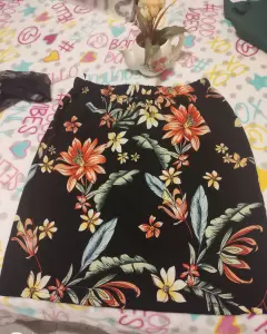Conjunto de flores. Conjunto de top y falda, de licra talla un poco más grande de la XL. Detalle de transparencia en las mangas del top, falda en línea recta. Largo a la rodilla aproximadamente.