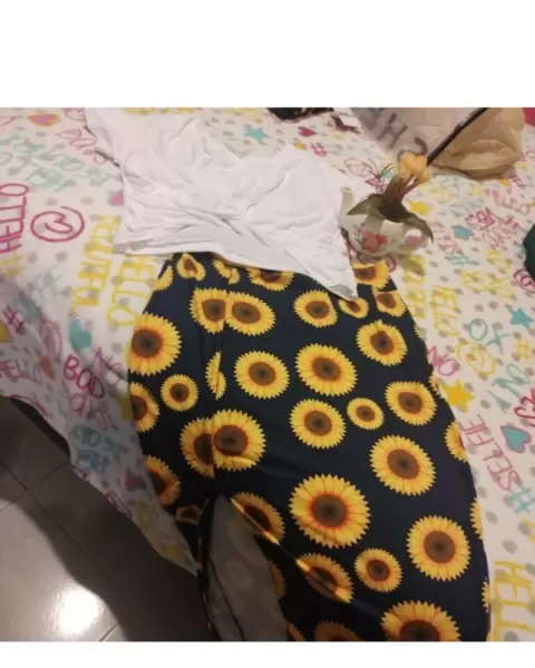 Conjunto de girasoles.. Lindo conjunto de licra da a una talla 36. Con detalle de apertura en la pierna.