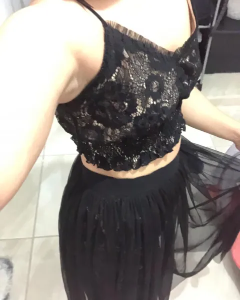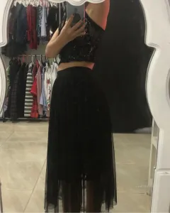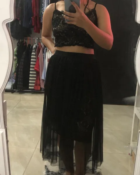 Conjunto de malla con encaje top y falda. Este conjunto lo puedes usar para eventos de cóctel o de noche!! Si necesitas más información escríbeme