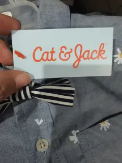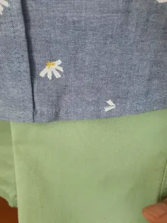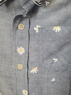 Camisa color mezclilla con estampado de flores, pantalón verde y mosca. Marca Cat & Jack. Talla 2.