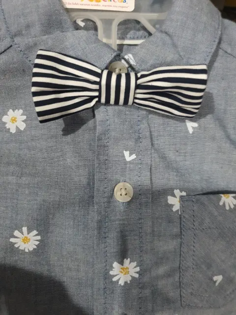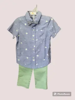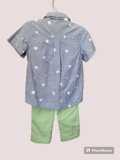 Conjunto formal. Camisa color mezclilla con estampado de flores, pantalón verde y mosca. Marca Cat & Jack. Talla 2.