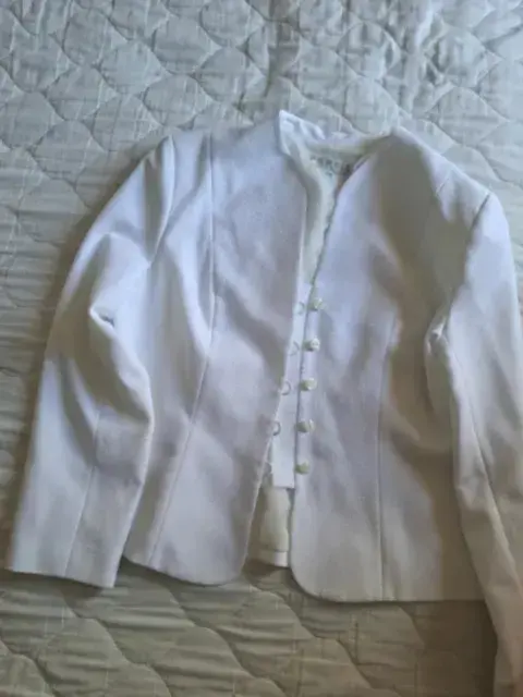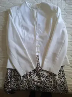 Conjunto para dama.. Este cuenta con 2 piezas, un saco blanco, con forro y botones, y la falda de resorte, en color café con estampado de flores, es ideal para una fiesta o para ir a trabajar, el saco es de manga larga, la falda cuenta con un fondo integrado, la falda da un largo abajo de la rodilla, esta en muy buen estado, una sola puesta.