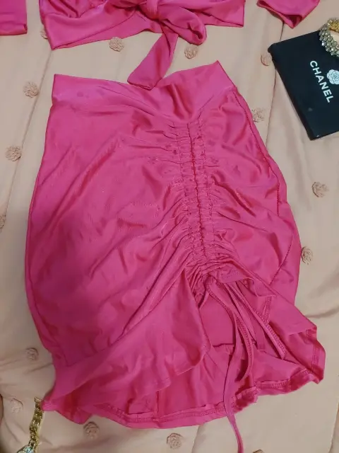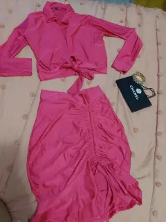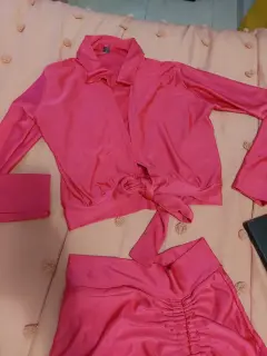 Conjunto rosa de satín. Hermos conjunto de falda con blusa La falda trae jareta ajustable para que elijas el tamaño que quieras usarSolo.se.usó para sesión de fotosEs satin strech Sin detalles