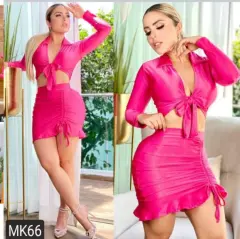 Hermos conjunto de falda con blusa La falda trae jareta ajustable para que elijas el tamaño que quieras usarSolo.se.usó para sesión de fotosEs satin strech Sin detalles