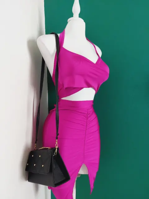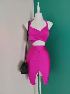Conjunto Top y Mini Falda Fiusha. Conjunto Top Cruzado y Mini Falda PlisadaAmbos de licra satinada.Talla ChIdeal para chicas sin mucho busto 🥰