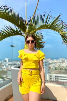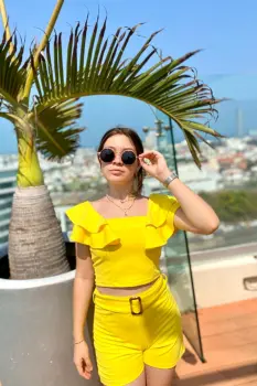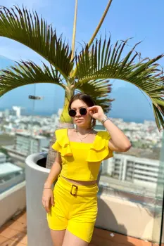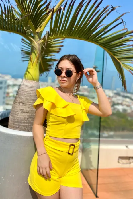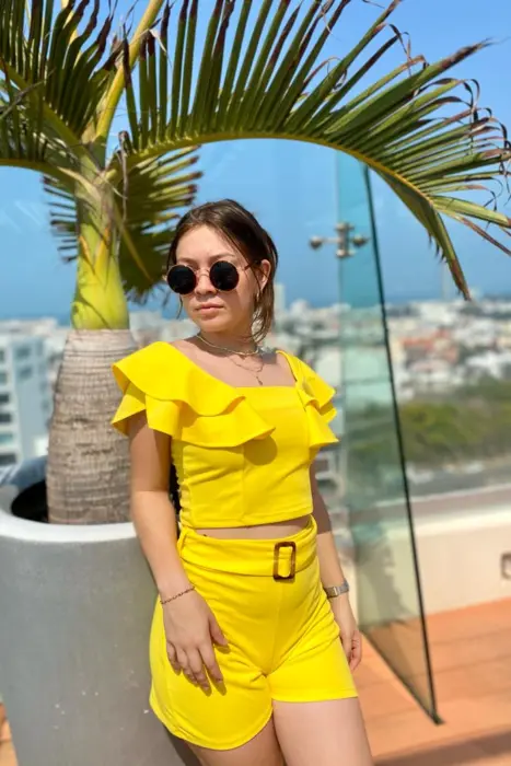 Conjunto top y short con cinturón amarillo. Esta hermoso. Son 2 piezas. La tela tiene strech. Disponible en talla Mediano (queda a una talla 5 a 7) y Grande (queda a una talla 9)MEDIDAS TALLA MEDIANO:Axila a axila 37cm estira hasta 50cmCintura 64cm estira hasta 82cmCadera 76cm estira hasta100cm