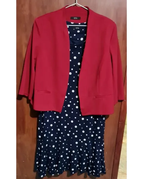 Conjunto Vestido Blazer Diva Rojo Marino. Espectacular conjunto de vestido con Blazer ajustable 100%, corte elegante!Vestido manga corta y blazer manga 3/4Talla 42, se le recortó la etiqueta de talla porque picaba en la espalda por lo tanto dejo las medidas: Vestido Largo 101 cm, Busto 62 cm, Manga 21 cm, Espalda 46 cm, Cintura 57 cm y Blazer Largo 58cm, Busto 67 cm, Espalda 47 cm y Manga 49 cmUsado un par de veces, en perfecto estado!