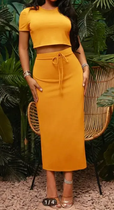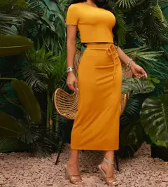 Conjuto blusa y falda. Nueva sin detalle. Se ve padrísimo con tenis o zapatillas. La tela estira bastante. Color amarillo mostaza