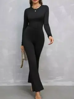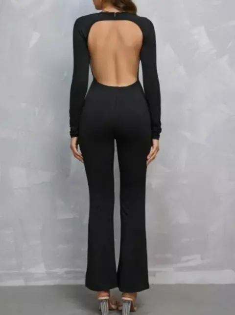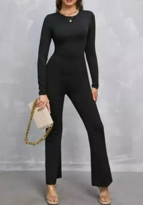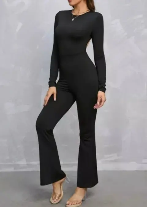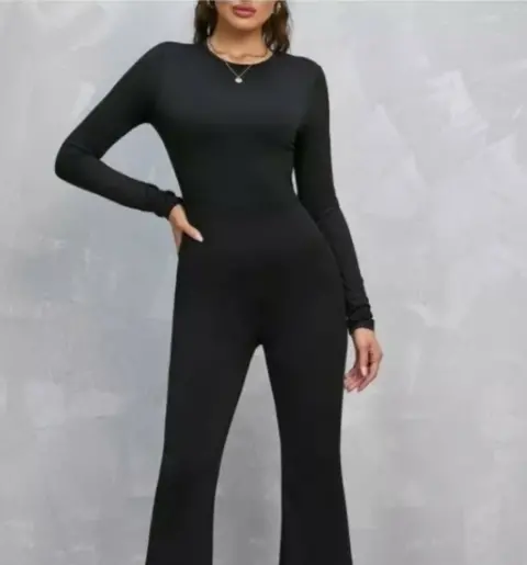 Hermoso Palazzo negro con escote trasero muy sexy estira y se amolda al cuerpo muy bien la verdad queda hermoso,es nuevo con etiqueta talla L es acampanado y un negro con poco de brillo como simulando piel tipo sintético aunque es tela, manga larga de la marca Jones