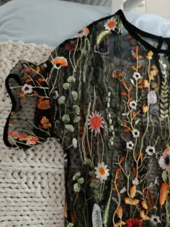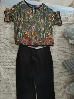 Pantalón negro talla 12petit marca Banana Repúblic. Blusa Sasha talla G translúcida con bordados florales. Acompañalo con sandalias de tacón. Lucirás muy femenina.