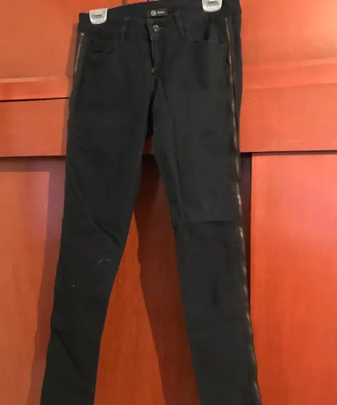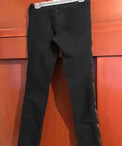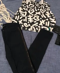 Blusa blanca con negro con olanes en espalda, talla M, Roxy. Pantalon negro con cierre lateral, talla 9, C&A