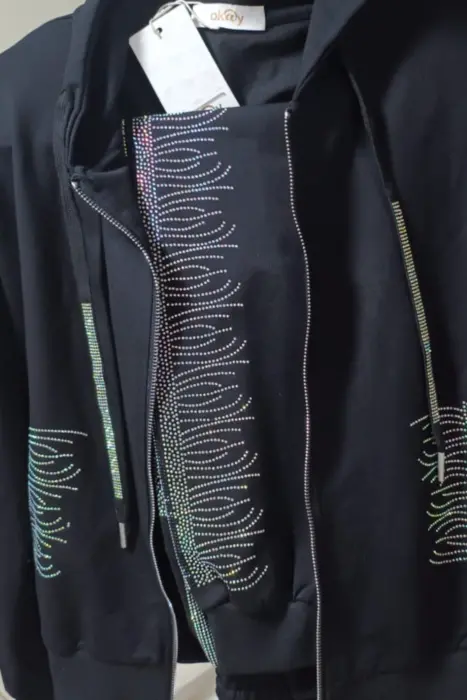 Pants dos piezas con incrustaciones de brillos. Pants dos piezas con incrustaciones de brillos. Color negro. A los lados tiene las piedras. Esta muy bonito. Brilla mucho.