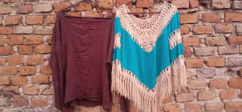 Dos prendas en el mismo envío!!!2x1 Hermoso poncho con mangas y tejido color turquesa y beige, blusita tela delgada y corrugada color café. Los dos talla M, muy poco uso, sin detalles.Muy poco uso, sin detalles