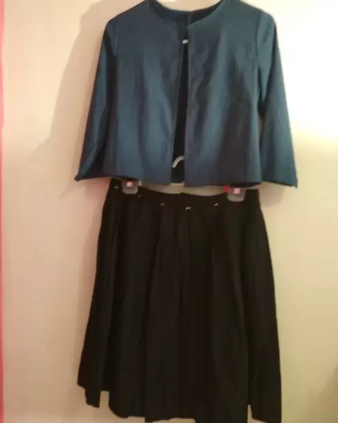 Saco y falda formal. 1 falda37cm cintura59largoCon forroExterior 70% seda 30% lino , forro 100% sedaTipo tableada ( no muy marcada)Color negro tipo campana1 saco talla chica a zul medio strech tela de saco a la cintura