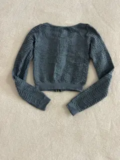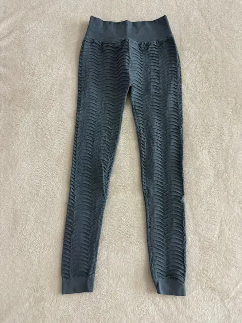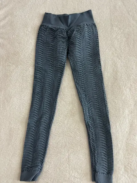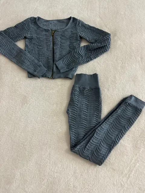 Set de ejercicio gris. Conjunto deportivo de legging y sudadera con textura, el pantalón tiene plisado en la parte de atrás