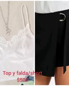 Top y falda/short. Hermoso conjunto shein Top tipo terciopeloFalda/short negro con cinturónQuedan a talla 7 máximo 9 El top a 32 de busto máximo