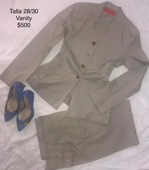 Traje sastre en color beige con costuras color naranja, el corte del pantalón es recto, el saco tiene marcada a cintura