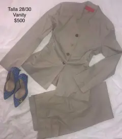 Traje sastre. Traje sastre en color beige con costuras color naranja, el corte del pantalón es recto, el saco tiene marcada a cintura