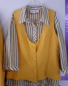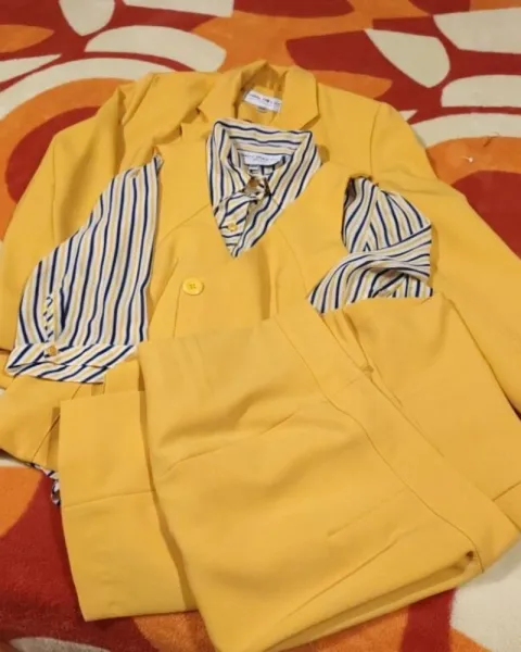 Traje sastre amarillo bello💛. ANN MILLER, TALLA MEDIANA, LYCRA, SACO, BLUSA, CHALECO Y PANTALÓN, BELLO, SE AMOLDA PERFECTAMENTE AL CUERPO.PARA UNA PERSONA DE ESTATURA 1.45 - 1.50ECHO A LA MEDIDA.