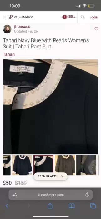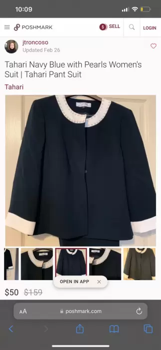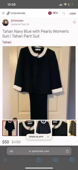Traje sastre marca TAHARI azul marino saco con perlas en el cuello manga 3/4 pantalón recto a la cintura una prenda muy elegante para cualquier ocasión