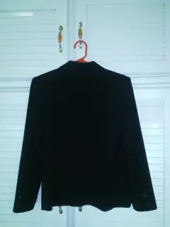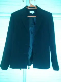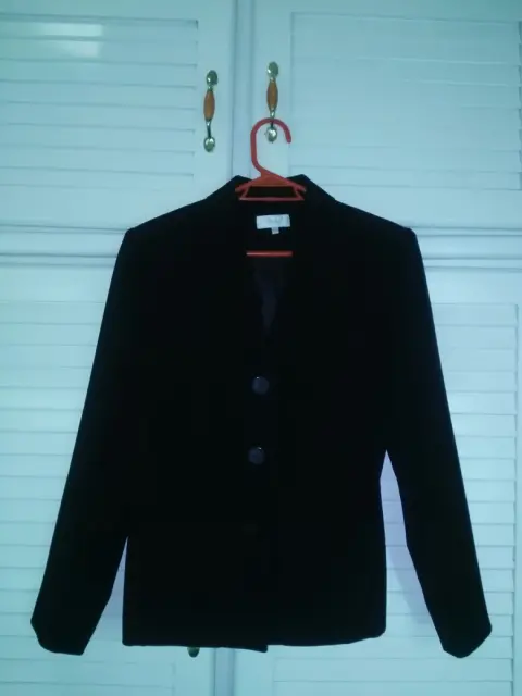 Traje sastre Christian, en color negro, pantalón con forro en poliéster y detalle de cinta para moño en la cintura, sin bolsas, saco a la cadera, con tres botones al frente, sin bolsas, talla 7/30.