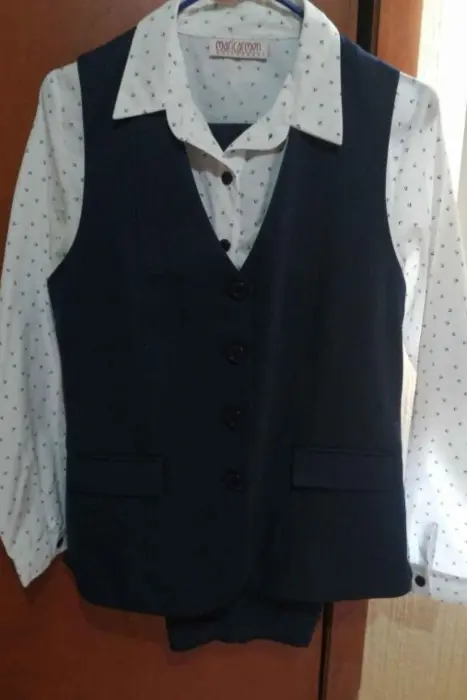 Traje sastre con poco uso, solo se uso tres veces.Incluye pantalón, camisa, chaleco y saco.El pantalón tiene un pequeño detalle en la parte de abajo pero no se nota, no afecta en nada.El pantalón es talla 9, la blusa, chaleco y saco son talla 7