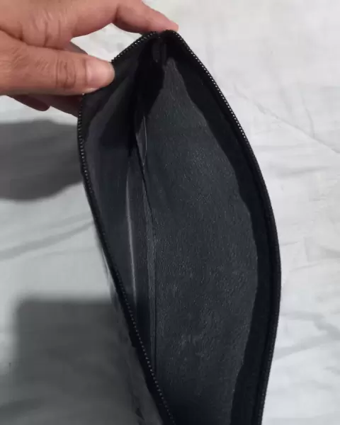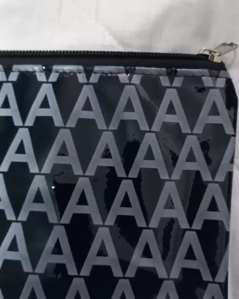 Cosmetiquera negra con grabado, plastificada con cierre.