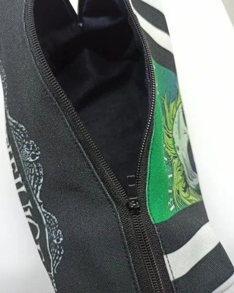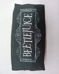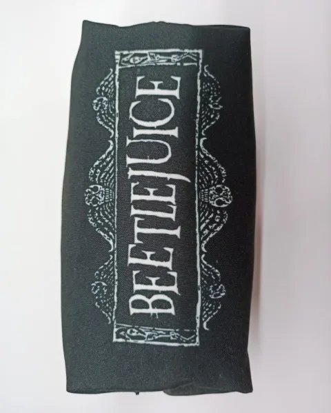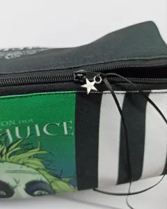 Cosmetiquera textil con estampado de beetlejuice, 20 x 10 x 10 cm, cierre plástico con colgante de estrella y listón satinado.
