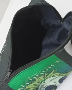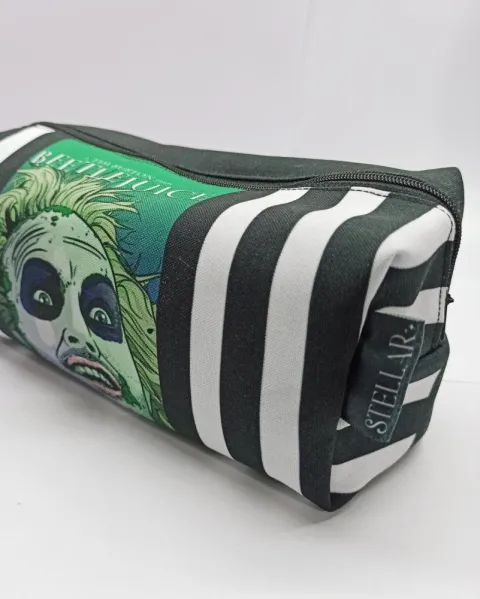 Cosmetiquera Beetlejuice. Cosmetiquera textil con estampado de beetlejuice, 20 x 10 x 10 cm, cierre plástico con colgante de estrella y listón satinado.