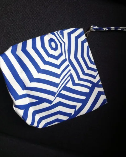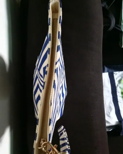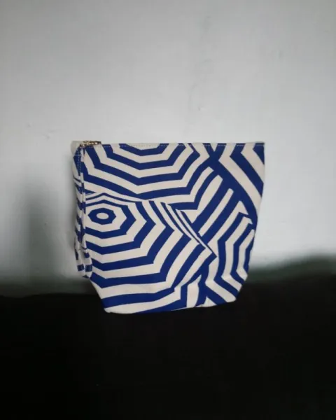 Cosmetiquera en rayas color azul rey con beige y es de tela fina y está forrada por dentro.Nueva sin etiquetaSus medidas son:Alto 24 cmAncho 25 cmBase 6 cm
