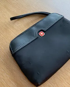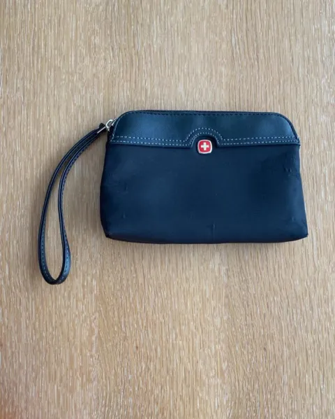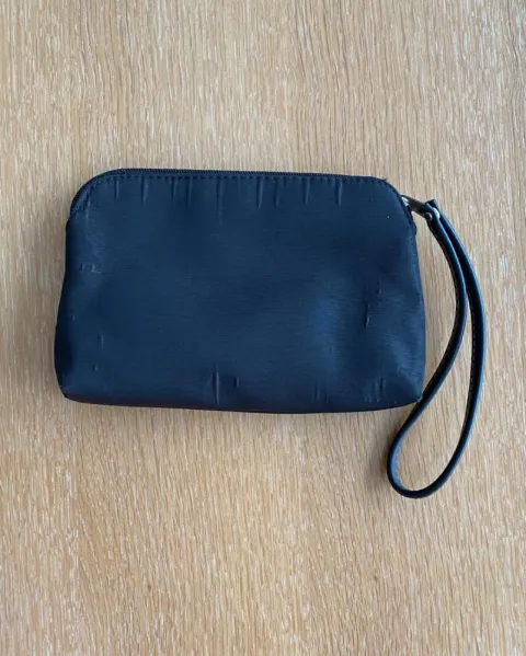 Cosmetiquera negra. Práctica Cosmetiquera con cierre y asa, ancho 19cm, alto 13cm y base 3 cm. Con algunos detalles de pliegues del material