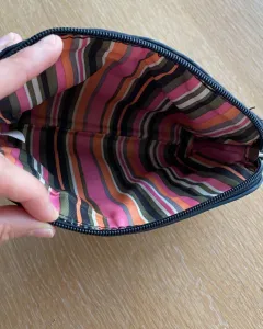 Práctica Cosmetiquera con cierre y asa, ancho 19cm, alto 13cm y base 3 cm. Con algunos detalles de pliegues del material