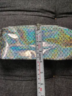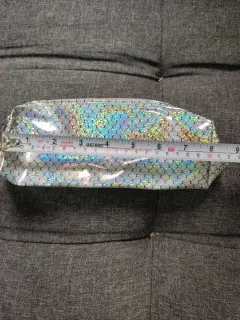 Ya estaba parado puede ser cosmetiquera o estuchera color plata tornasol con diseño cola de sirena de plásticoTiene unas medidas de 21 cm aproximadamente de ancho y 10 cm aproximadamente de alto con un fondo de 6 cm aproximadamente