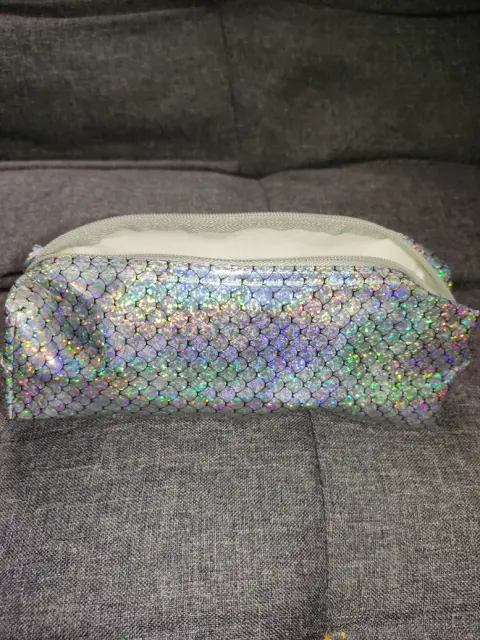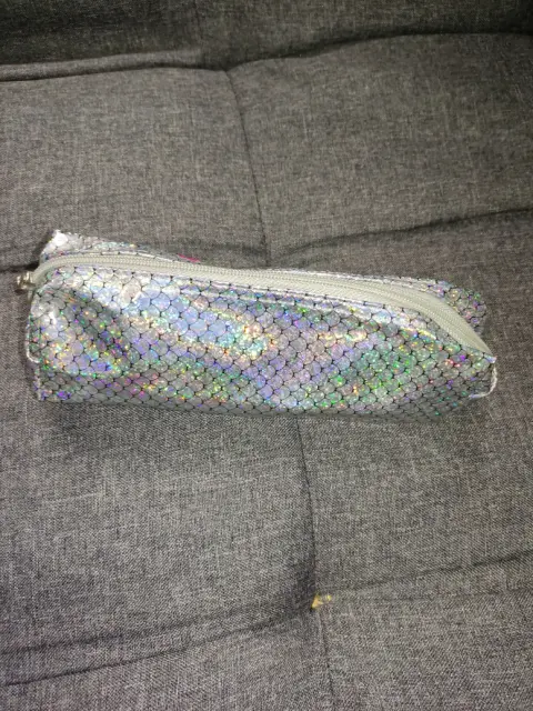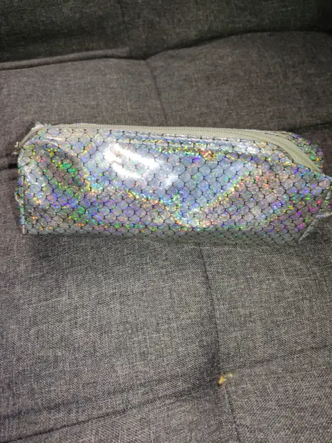 Cosmetiquera plata cola de sirena tornasol. Ya estaba parado puede ser cosmetiquera o estuchera color plata tornasol con diseño cola de sirena de plásticoTiene unas medidas de 21 cm aproximadamente de ancho y 10 cm aproximadamente de alto con un fondo de 6 cm aproximadamente