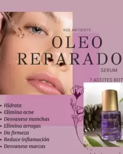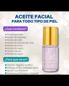 Aceite facial. Ayuda a reparar y purificar la piel, protege de los radicales libres el ADN celular y mejora la vitalidad, tonicidad, firmeza e hidratación de la piel. Contiene 8 aceites naturales y un activo marino que favorecen la actividad de las funciones celulares. Tiene un aroma riquísimo y deja la piel suave con aspecto matificante.