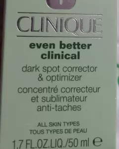 Clinique Even better clinical dark spot corrector & optimizerClinique Even Better Clinical Serum es un suero corrector y antimanchas para pieles con imperfecciones.Finalidad: Antienvejecimiento, Reducción de melanina, Tratamiento de cicatricesTipo de envase: Botella, Botella con bomba
