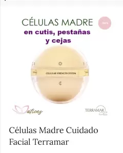 Crema facial de células madre. Crema de día: Combate los signos de la edad mejorando los procesos naturales de la piel, revitalizando y dando un aspecto juvenil a la piel cansada. Brinda a la piel acabado sedoso y aterciopelado, contiene micro esferas que ayudan a hidratar y dar un efecto de relleno en líneas y arrugas. La piel recobra su fuerza, tono y luminosidad. Contiene vitaminas A, C y E que ayudan a evitar el daño de los radicales libres con su poder antioxidante, estimulan la producción de colágeno, proveen luminosidad a la piel y disminuyen líneas finas y arrugas. Contiene aceite orgánico de argán.