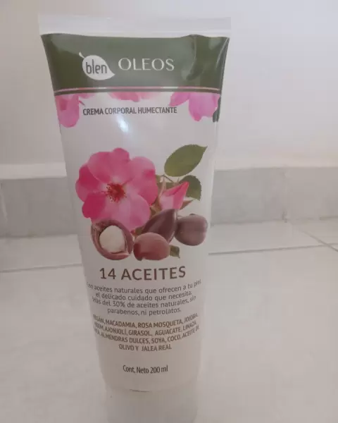 Crema humectante 14 aceites. Crema humectante de 200 ml. Contiene 14 aceites que nos ayuda a humectar nuestro cuerpo. Al usarla en piernas reduce la aparición de varices. Y si están presentes ayuda a reducir o a aligerar el problema. Al utilizarla en todo el cuerpo ayudamos a que nuestra piel se vea humectada.