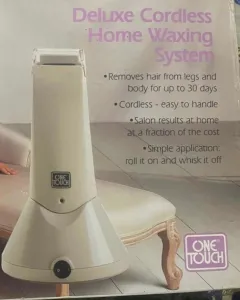 Depiladora de cera. Incluye 2 botellas de cera, 2 rodillos para aplicación de cera, bandas para depilación en cera, máquina para cera y calentador de cera.Tiene un detalle pero no afecta su uso.